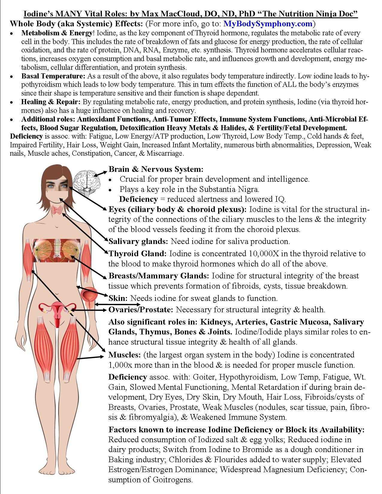 Click on the diagrams/images to left for Iodine’s many roles in the body. The first section focuses on some of the major Systemic (or whole-body) roles of Iodine. The second one covers some of the body of the top role part by body part. As you can see, Iodine is vital for a whole lot more than the thyroid (although that is super important as well).