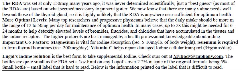 Lugol's Iodine Solution is the best way to provide Iodine & Iodide to the body's cells. It has been used successfully since its invention in 1829. Most Americans are deficient in Iodine based on government studies and that is based on a grossly inadequate RDA of only 150mcg. The Japanese consume over 100 times this amount and are far healthier in many key areas than Americans. Iodine is vital for all glandular function and structural integrity.